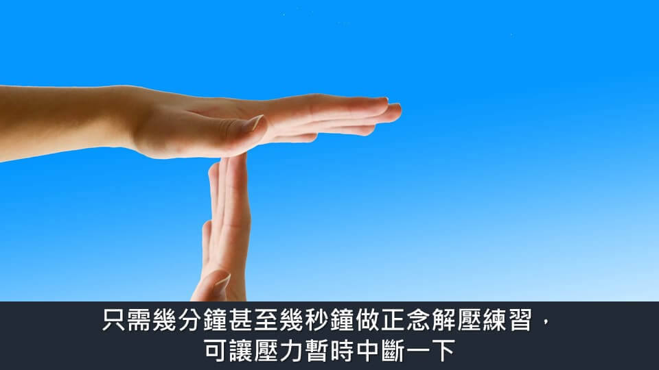 也就是說,每次只要短短幾分鐘甚至幾秒鐘做正念解壓練習,會讓壓力暫時中斷一下,所以只要持續地去做,不斷注意自己正在壓力中,那壓力就會斷斷續續減緩。也許有一天,你的壓力源就會斷,就不會感到壓力。