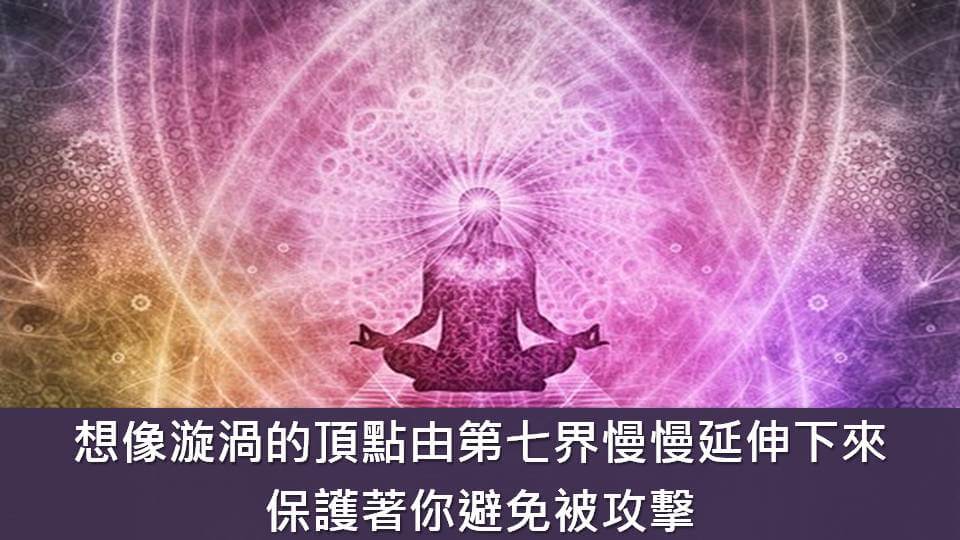 想像漩渦的頂點是由第七界慢慢延伸下來保護著你,這樣就能避免被攻擊,建議每兩週更新一次漩渦,保護你自己以及你我擁有的一切,最好的習慣是每天都跟造物主交談,比較不容易會被攻擊到,當你時常了解造物主的能量並保持連結,不可能會被任何負能量攻擊的,就像春天的雪一樣很快就融化了。