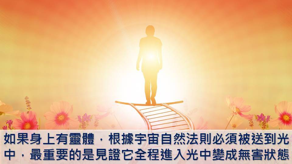 如果你的身上有靈體,根據宇宙的自然法則,他們必須要被送到光中,最重要的是要見證髒東西全程進入到光中變成無害的狀態,避免它中途跑掉,如果你的觀想能力沒有很強,可以直接想像它從你身上離開送到光中,會看到灰黑的能量離開你身上的能量場,去感覺,自己的能量有改變就是對了。