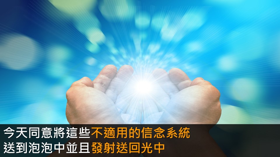 想像金錢信念的阻礙已經不再適用於自己的信念,像是我很匱乏、有錢很危險、貧窮很安全、甚至是貧窮的誓約,今天同意將這些不適用的信念系統,送到泡泡中並且發射送回光中。