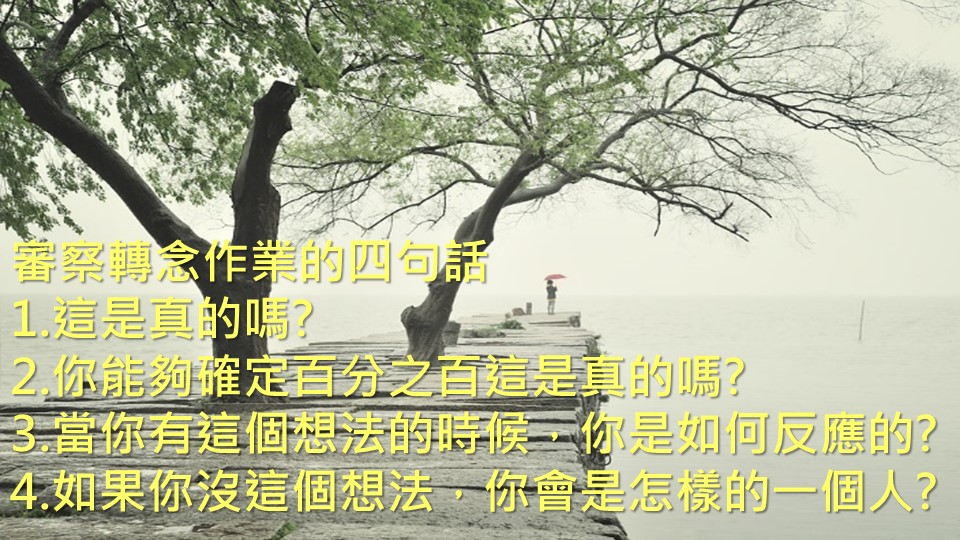 所以拜倫.凱蒂提問了四句話,因為我已經寫出我的想法跟信念讓我痛苦的,所以下面就要做的是,提問四句話