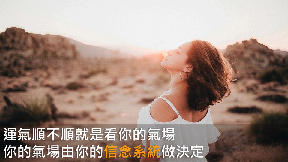 這個世界上有很多不同的能量,我們人也是一個能量,運氣順不順就是看你的氣場,你的氣場由你的信念系統做決定,如果你一直散發出我很倒楣,我很倒楣,你的氣場就一直吸引倒楣,但如果你說我是全世界最幸運的幸運兒,我最開心了,我很快樂,你身上就會吸引很多很多的正能量,或者說你是很陽光的、快樂的、身上充滿正能量,像我是一個不會被負能量攻擊的人,我會知道對方在想什麼,我也是大家口中的敏感體質,但我是敏感卻不會被攻擊。