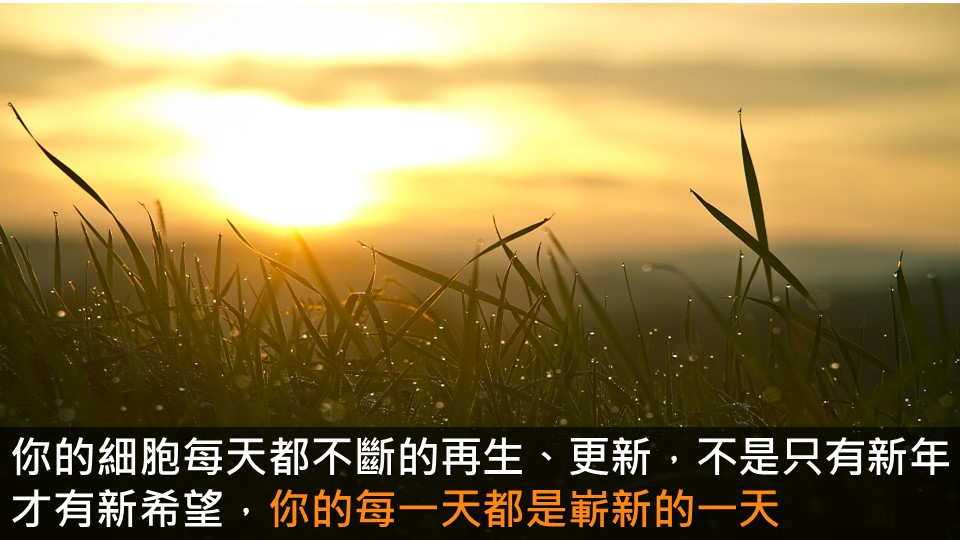 J: 你的細胞每天都不斷的再生、更新,不是只有新年才有新希望,你的每一天都是嶄新的一天。每天我們會受到外界不同事物的影響,而產生很多不同的信念,外界的影響有些是很不錯的,有些是沒有共鳴但會影響到你的,新年新希望可以理解細胞內有什麼在阻礙你,去顯化創造你想要的,去自我察覺一下。
