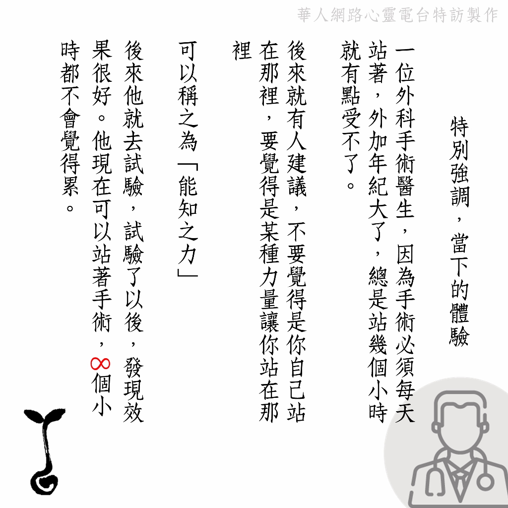 有一個外國的外科手術醫生,曾經他去參加一個法會,我的老師也是在場。因為外科手術必須每天站著手術,外加年紀大了,總是站幾個小時就有點受不了。
