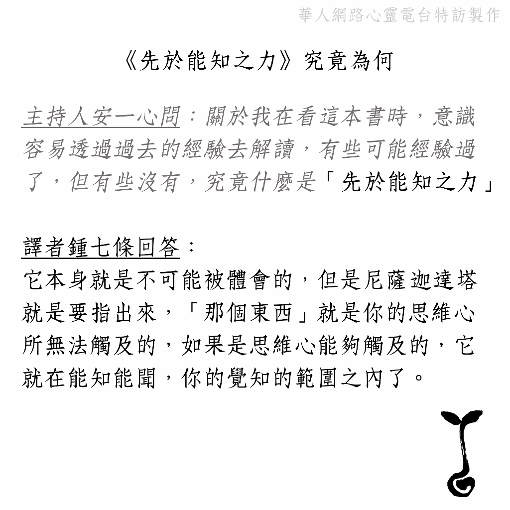 鹿編:本輯為 安一心採訪《先於能知之力》的譯者 鍾七條