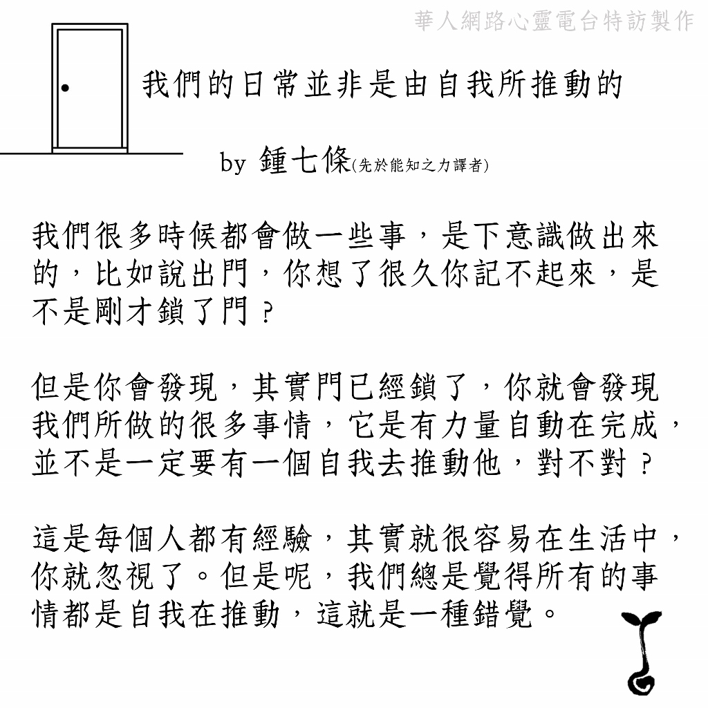 但是你會發現,其實門已經鎖了,你就會發現我們所做的很多事情,是有力量自動在完成,並不是一定要有一個自我去推動它,對不對?