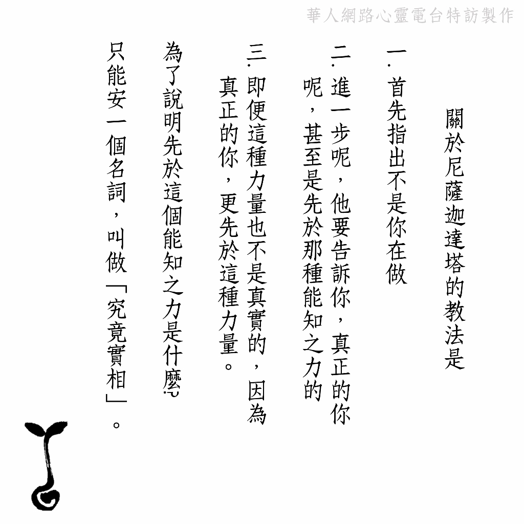 但是呢,首先尼薩迦達塔他們的一般的指引首先是指出兩步,首先是指出你在做的事情並非是你真正在做,是能知之力在做,我可以再舉兩個小例子,讓大家有一些直觀的體驗。