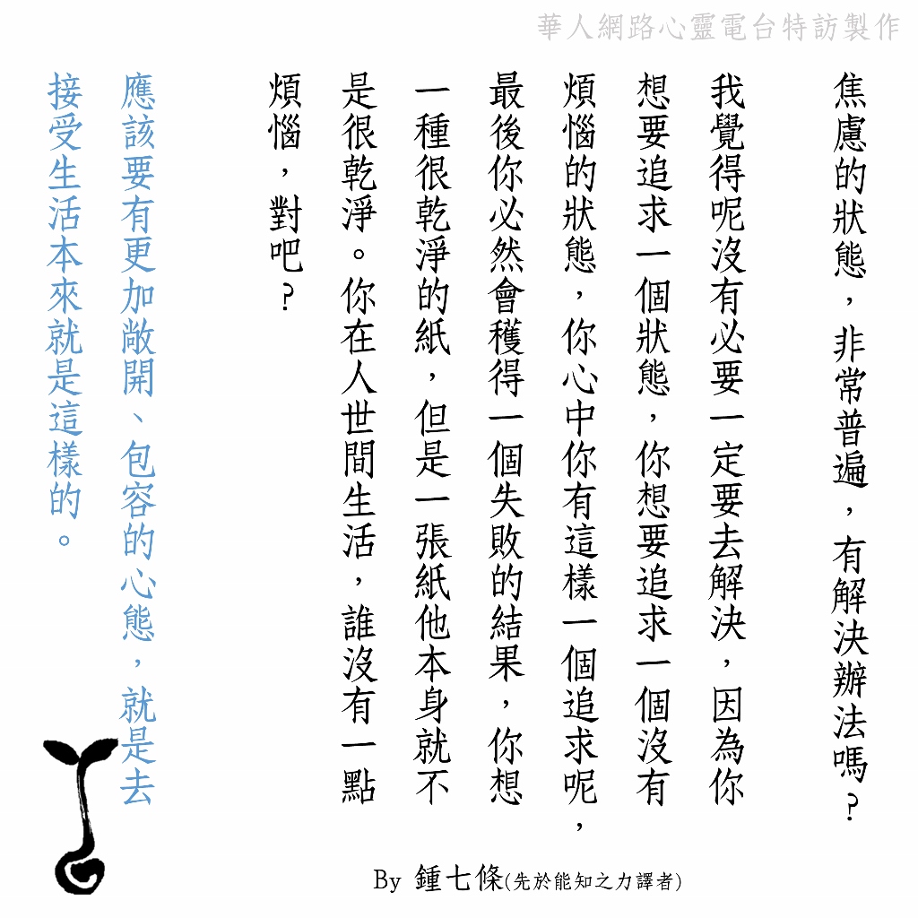 全部內容富含哲理與精華,因此特別重新整理文字內容,提供給華人網路心靈電台的朋友,希望大家可於聆聽後,對於訪談內容有更深刻的理解