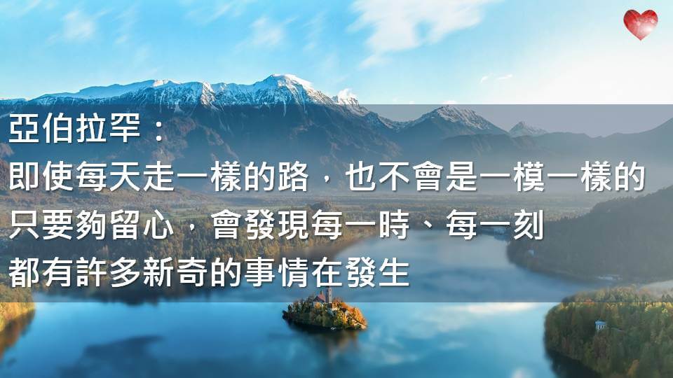 就像亞伯拉罕說的:「即使你每天都走一樣的路上下班,那也不會是一模一樣的,只要你夠留心,你會發現每一時、每一刻,都有許多新奇的事情在發生!」