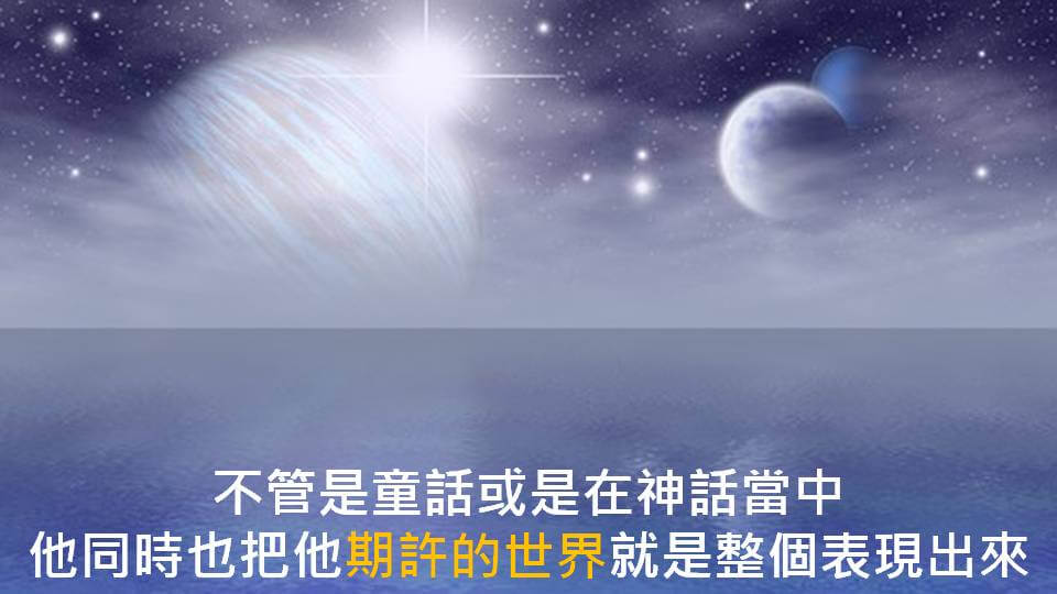 那這也是說為什麼我們會就是喜歡…榮格的人通常對故事會有些好奇,就是因為在故事當中,就是不管是童話或是在神話當中,當人在他的…從他的想像世界記取這些素材 的時候呢,他同時也把他的期許的世界就是整個表現出來。