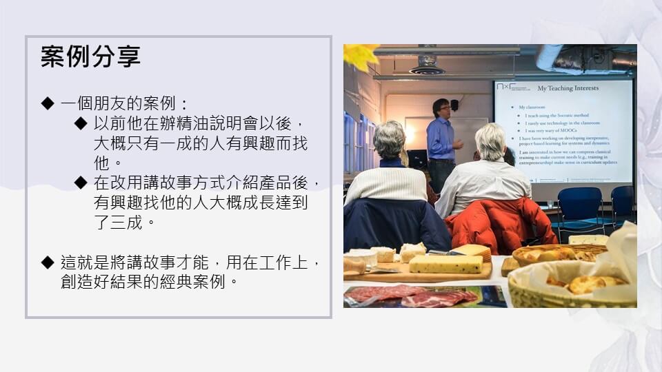 後來,他開始實驗,講個案用什麼精油得到什麼好處,花了很多時間在講故事。而在改用講故事方式介紹產品後,有興趣的人大概成長達到了三成。他將講故事用在了工作上,創造出好結果。