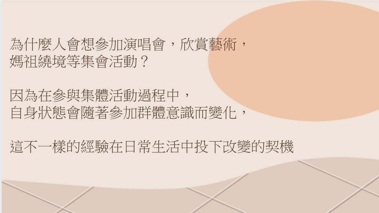 參加集體活動,有時會變成自身的一個經驗,而此經驗有可能會變成生中很重要的一部分。