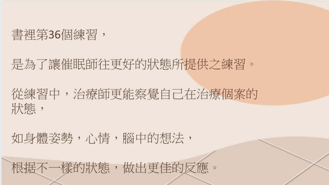 在推薦序裡有提到,在2002年我在鳳凰城參加艾瑞克森基金會的課程時,在課程中做了書裡第36個練習,這練習的目的是讓催眠師往更好的狀態所做的練習。