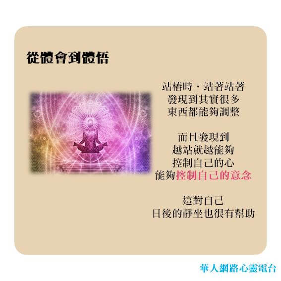 那當時其實他也就是…我的困擾他其實也不會馬上給我解答,他就叫我站樁。所以這個時候呢,我在站樁,站著站著…我發現到其實很多東西,就能夠調整,而且我發現到我就越站,我就越能夠控制我自己的心、我能夠控制我的意念。