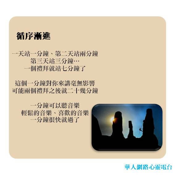 你就是一天站一分鐘、我第二天站兩分鐘、第三天我站三分鐘…一個禮拜你就站七分鐘了,而且這個一分鐘對你來講你毫無影響,然後呢~ 你可能就兩個禮拜之後呢就二十幾分鐘啦。