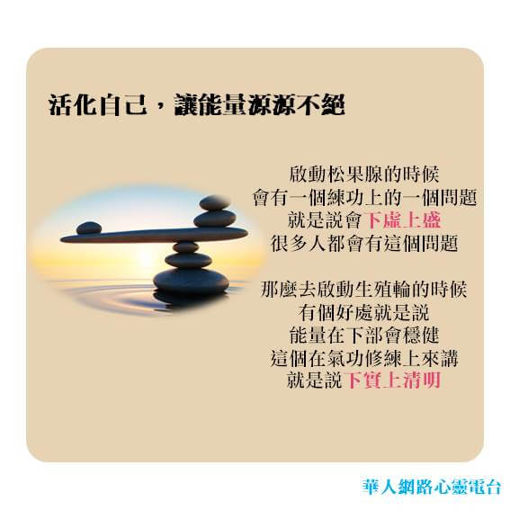 而且呢,我們已經讓他下實、下盤穩健的時候,它能量自然會一直去輻射我們的松果體。所以說你就二十四小時去活化它了。