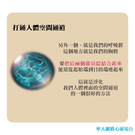 那另外一個呢,就是我們的呼吸群,這個地方就是我們胸腔的整個能量會動起來,要把這兩個能量給結合起來,能量從起始端到目的端連起來,這就是淨化我們人體裡面的空間通道的一個很好的方法。