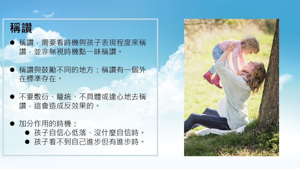 而且,需要看時機與孩子表現程度來稱讚,並非無視時機點一昧地稱讚。