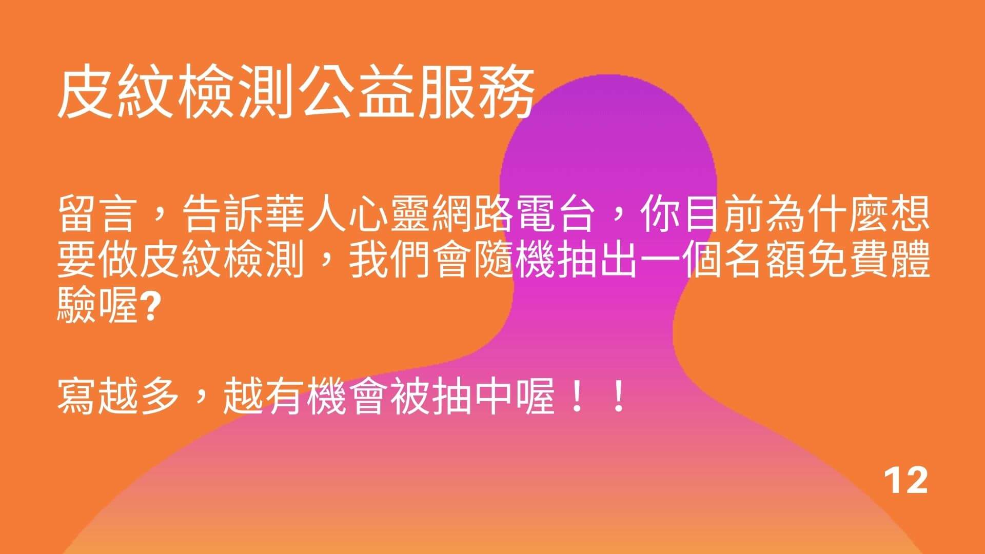華人心靈網路電台,幫大家爭取到一名免費名額,可以來做「皮紋學理檢查」