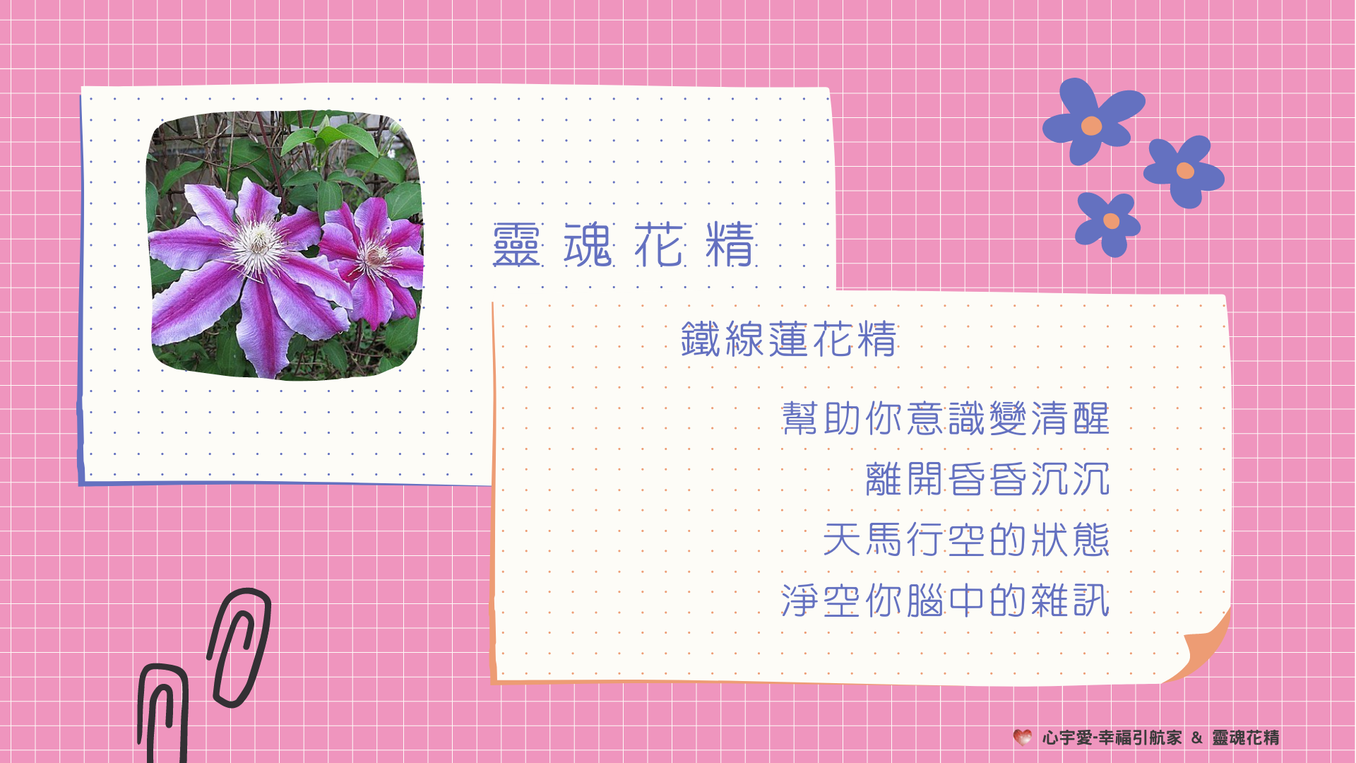【靈魂花精神祕學-解夢花精之鐵線蓮花精】心宇愛幸福引航家 smile spirit