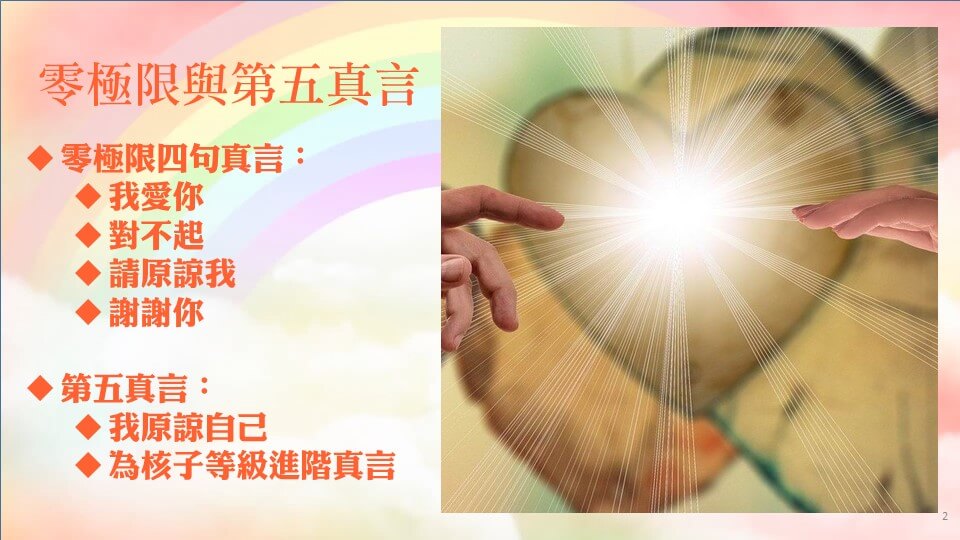 作者是在接觸零極限並反覆練習這四句話的基礎上,才找到這第五句話的。所以,我們在好好使用練習這四句話之後,在這樣子的基礎下,你可能清理一陣子之後,再使用這句,也是更有核子等級的力量。