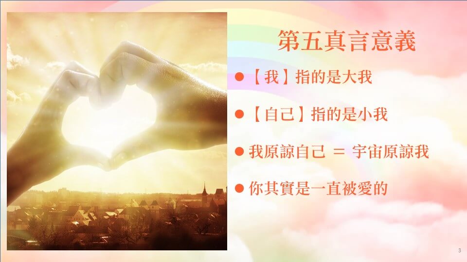它的力量在於說,我們並不會被我們這個大的宇宙來批判,我們現在一直在修煉、會犯很多錯,但這些都是被容許的,我們一直在進修這個課程。所以它有一個很深的意涵,【我原諒自己,也就等於宇宙原諒我】,這句話本身就是告訴你,其實你是一直被愛的。