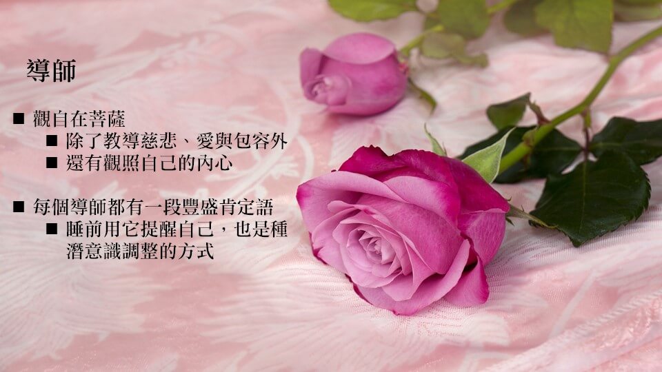 這個東西,都是我們可以運用在生命裡面的教導,所以當我們感受到觀音的時候,在我的書裡後面每一個導師都有一段豐盛肯定語,其實我們可以每天睡前,藉由這個豐盛肯定語去提醒自己。