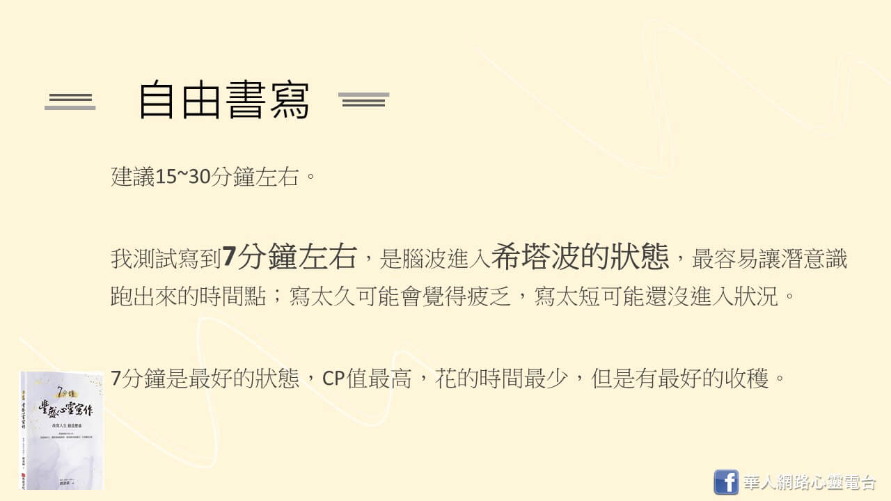我自己測試過寫到7分鐘左右的時候,剛好是腦波進入希塔波的狀態,最容易讓潛意識跑出來的時間點;寫太久可能你會覺得疲乏,寫太短你可能還沒進入狀況,所以我們自己這樣跟學生上課,實驗過的,大概我們寫到5、6分鐘的時候,差不多是極限,再過那1分鐘,就是最好的一個狀態,也是CP值最高。你花的時間最少,但是有最好的收穫。