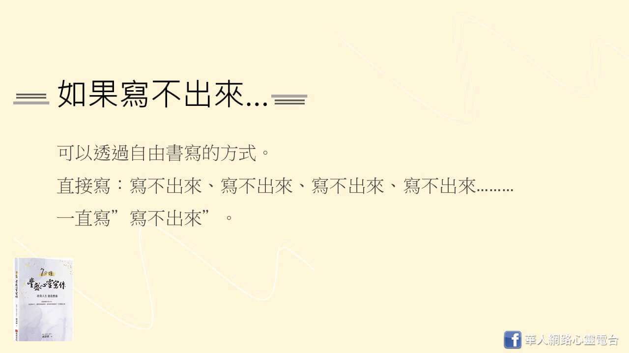 心靈寫作:針對內在特定的情緒,有哪些地方是卡住的?針對特定的議題做書寫。