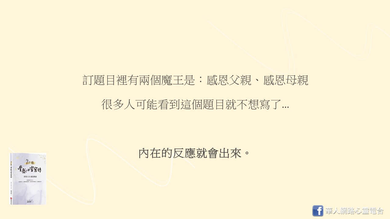 例如,我常常開玩笑說,訂題目裡有兩個魔王是:感恩父親、感恩母親