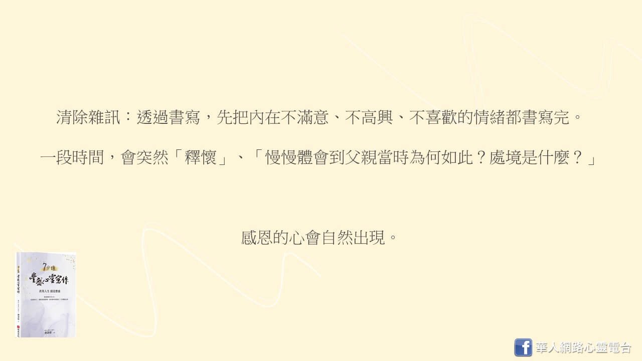 寫一段時間後,你會突然發現「好像慢慢能釋懷了」、「慢慢能體會到父親當時為何如此?處境是什麼?」,那個感恩的心會自然出現。
