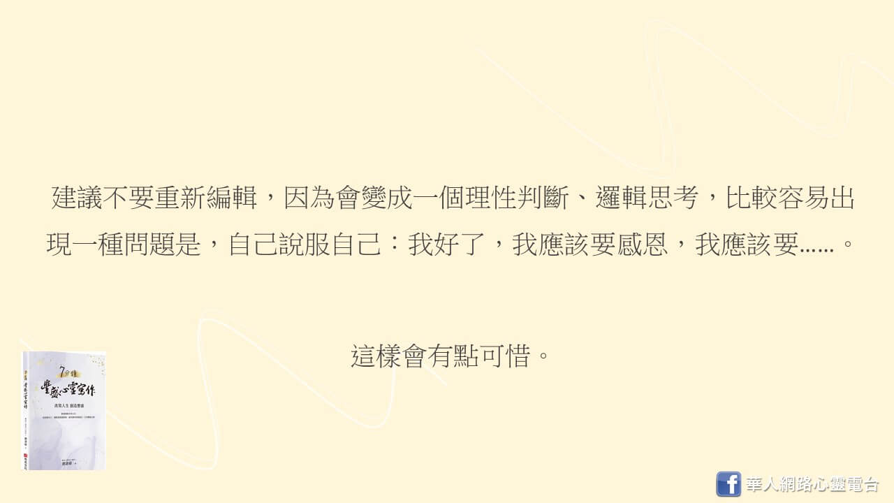 如果是我,我會建議不要重新編輯,因為它會變成一個理性判斷、邏輯思考,比較容易出現一種問題是,有時候我們反而會自己說服自己:我好了,我應該要感恩,我應該要……。