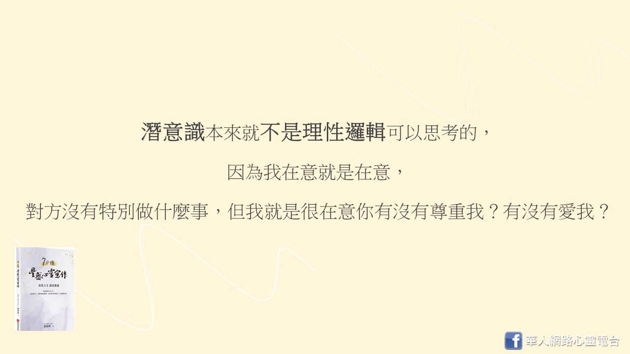 潛意識本來就不是理性邏輯可以思考的,因為我在意就是在意,對方沒有特別做什麼事,但我就是很在意你有沒有尊重我?有沒有愛我?