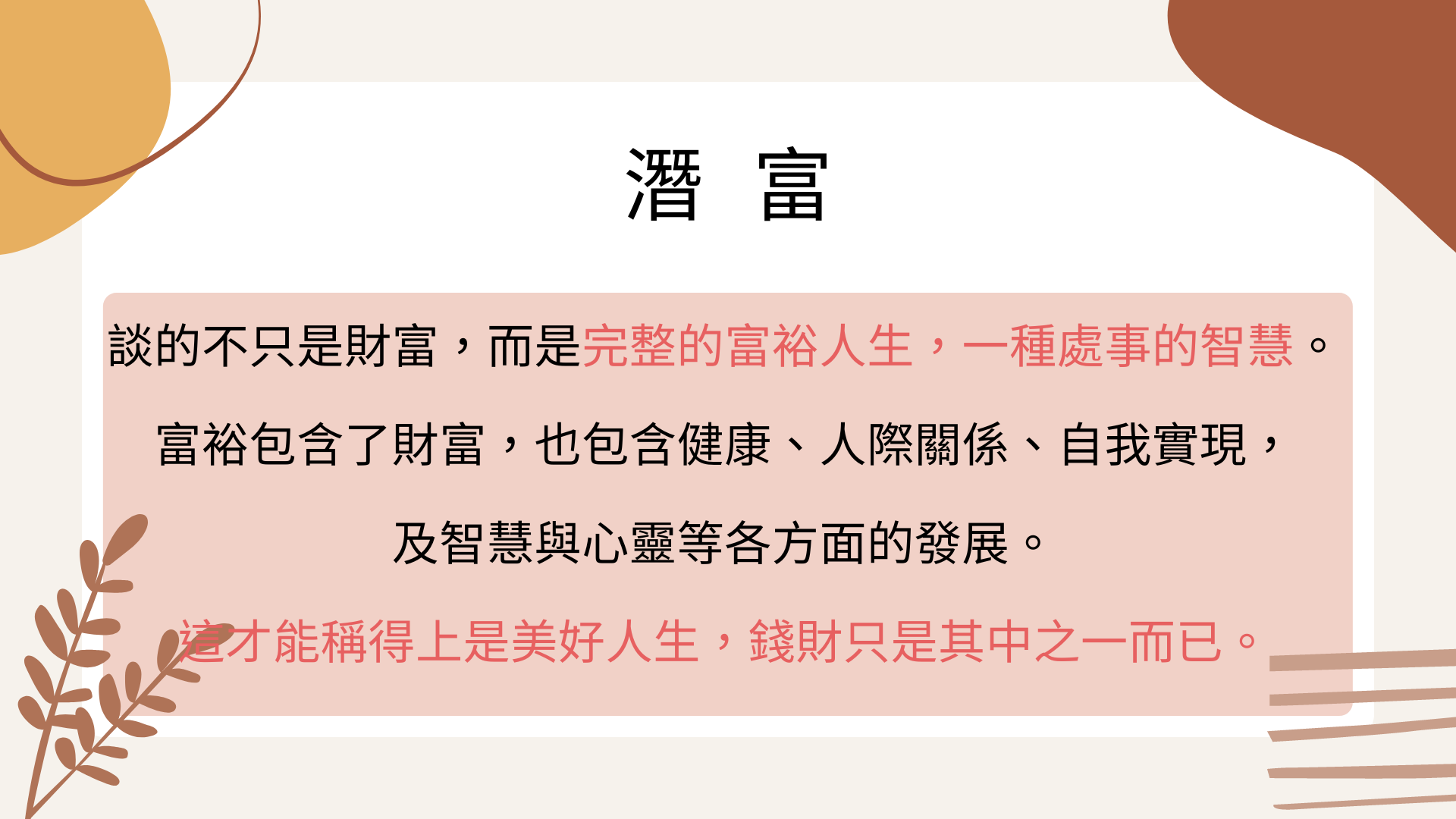 所謂的富裕包含了財富,也包含健康、人際關係、自我實現,還有智慧與心靈等各方面的發展。