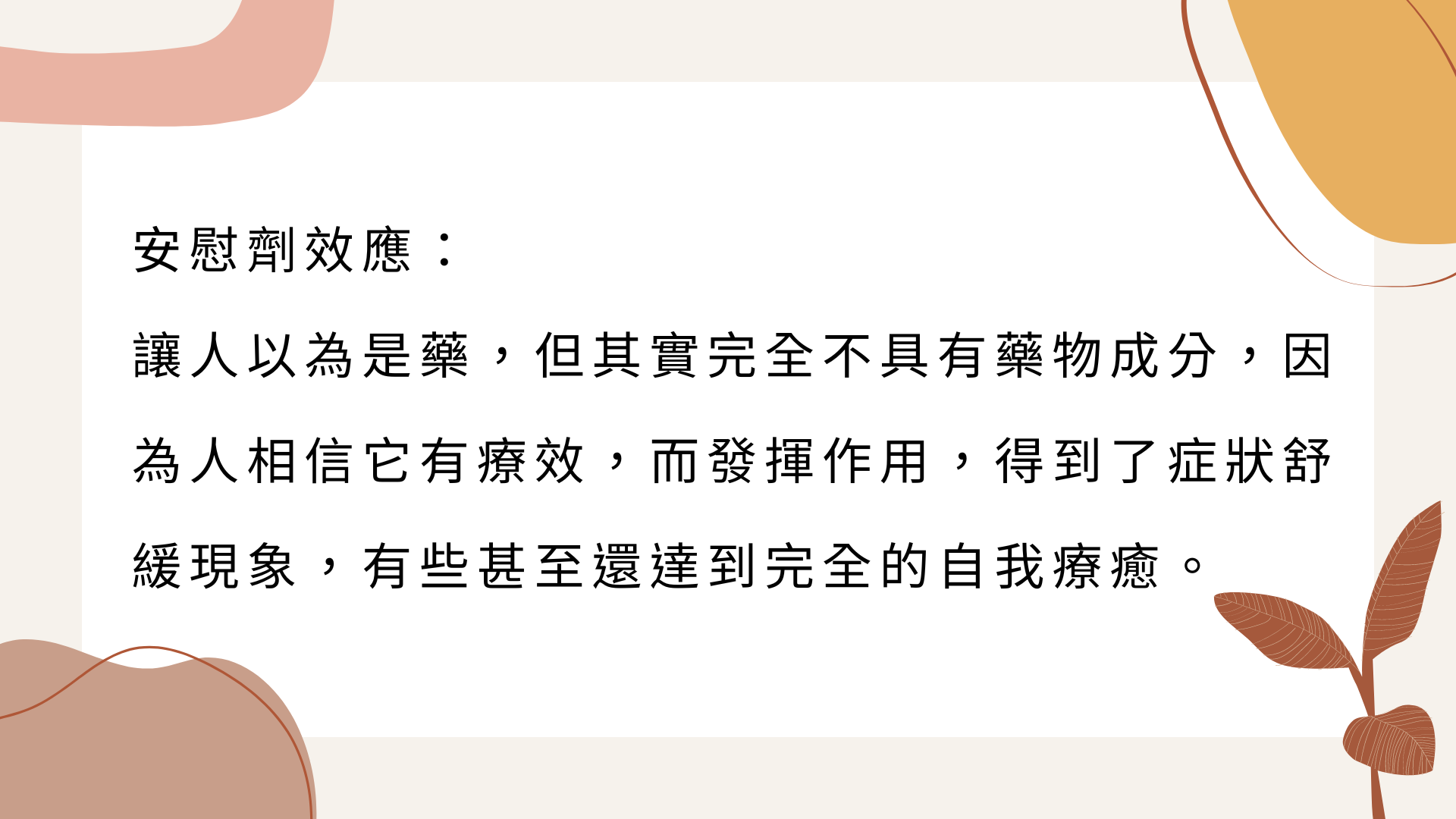 安慰劑是一種讓人以為是藥,但其實完全不具有藥物成分,因為人相信它有療效,而發揮作用,得到了症狀舒緩現象,
