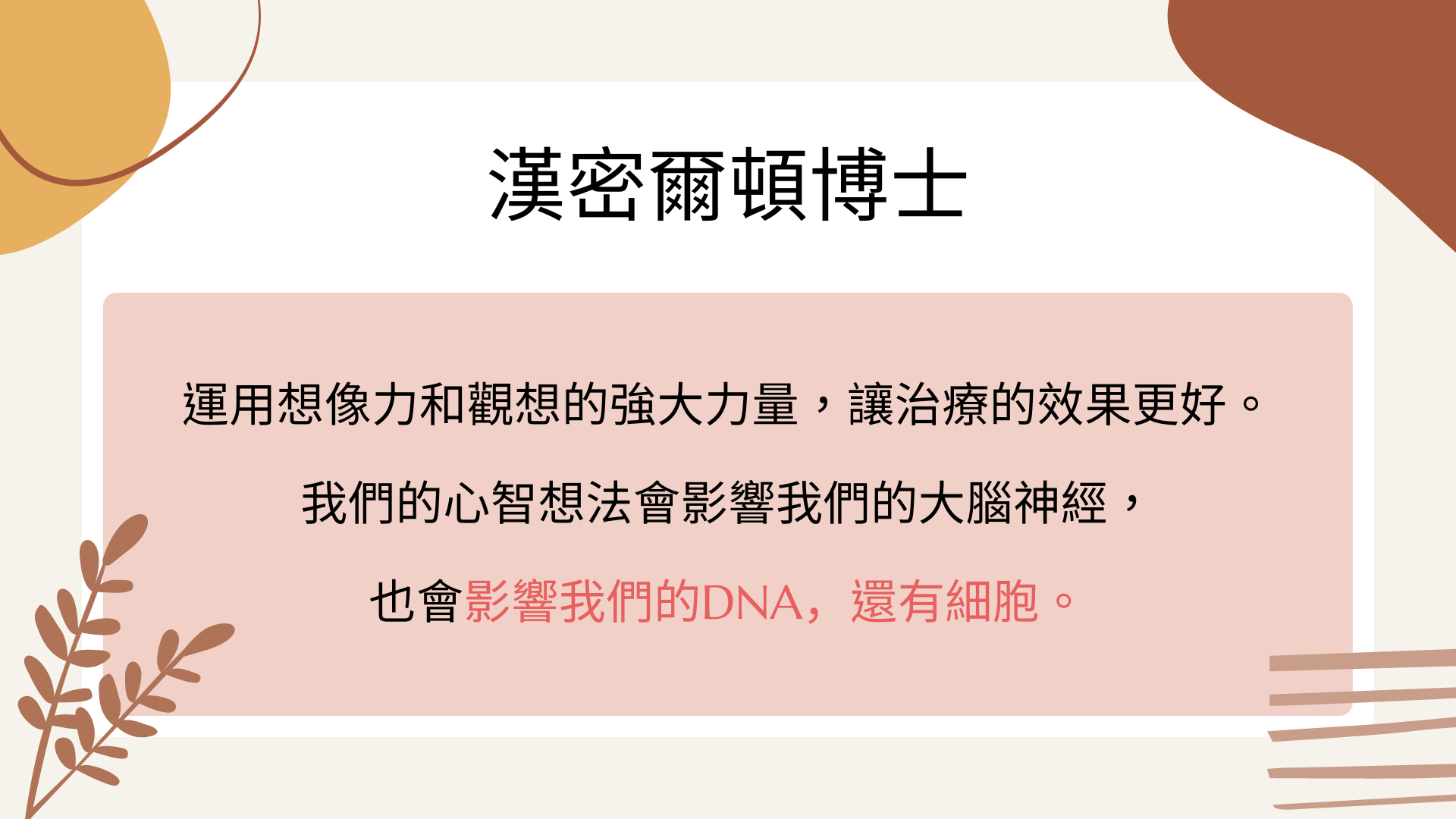 另一位漢密爾頓博士則是分享到,我們可以運用想像力和觀想的強大力量,讓治療的效果更好。