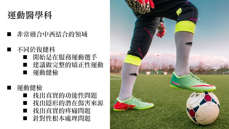 現在,其實我們也可以享受到運動醫學科給我們的治療,只是據點相對較少,相信未來是會越來普及的。