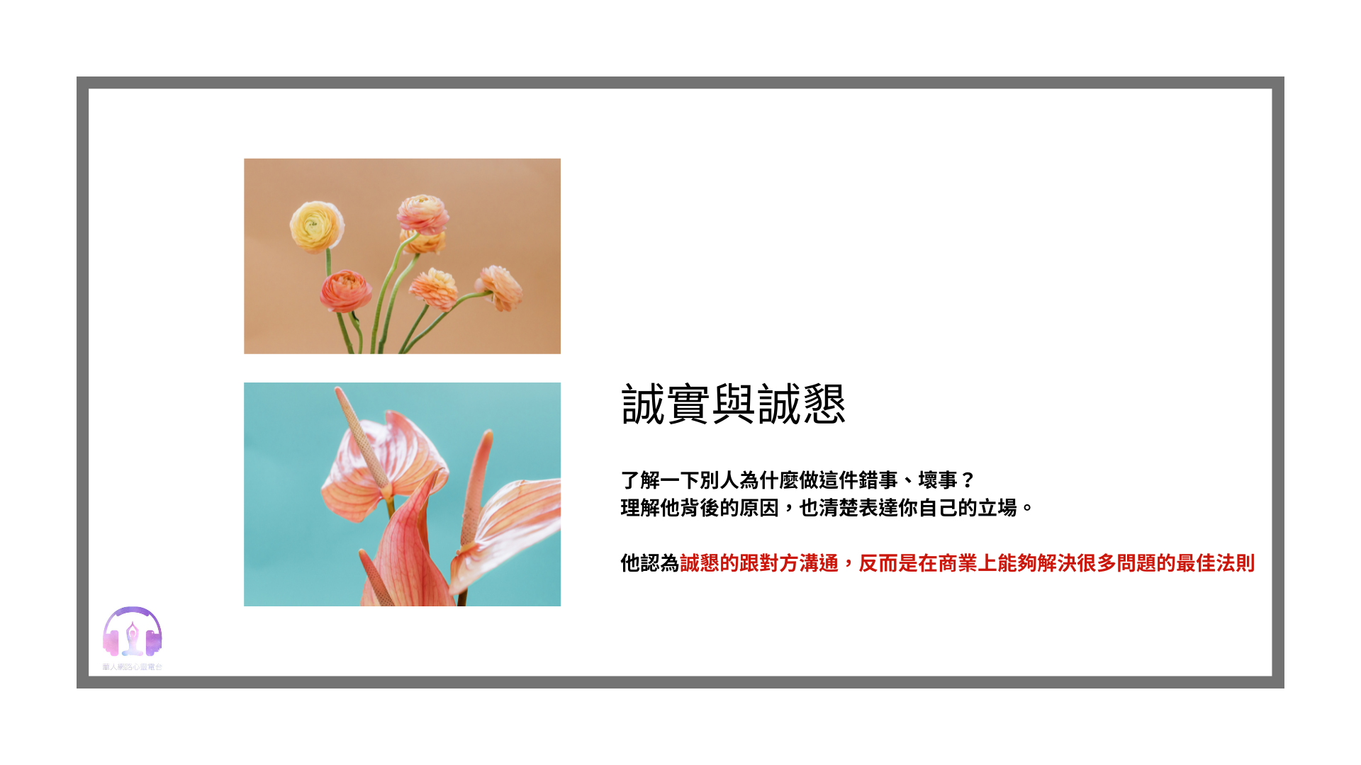 他認為誠懇的跟對方溝通,反而是在商業上能夠解決很多問題的最佳法則。