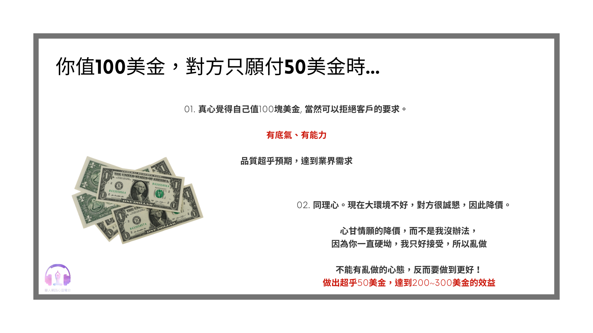 當你真的值100塊美金時,也許對方問了一圈會有價錢比你低的,但是因為他知道你的品質,所以他還是會接受你的100塊美金喔!