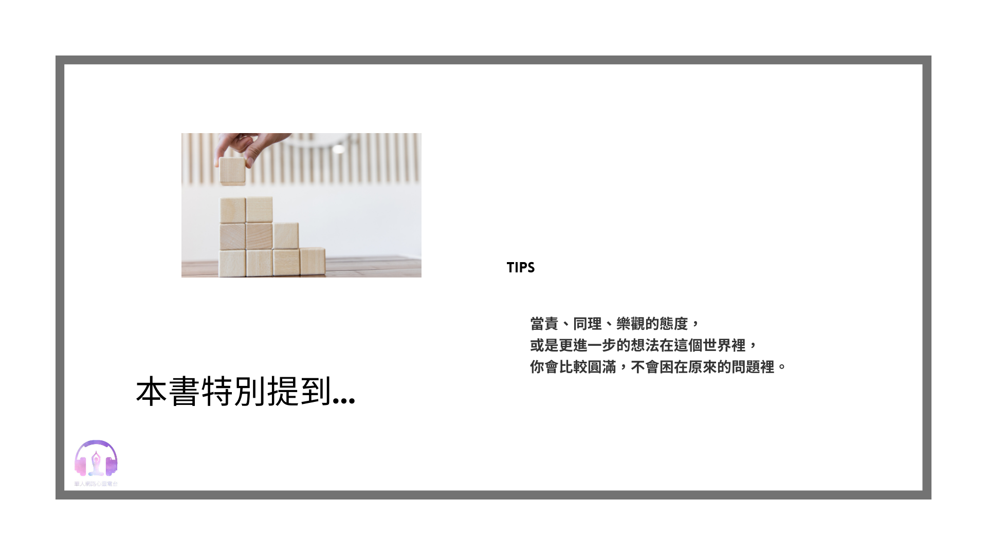 像在書裡面有特別講到當責、同理,或者是必須要有一些樂觀,或是更進一步的想法在這個世界裡,你就會比較圓滿,不會困在這個問題裡。