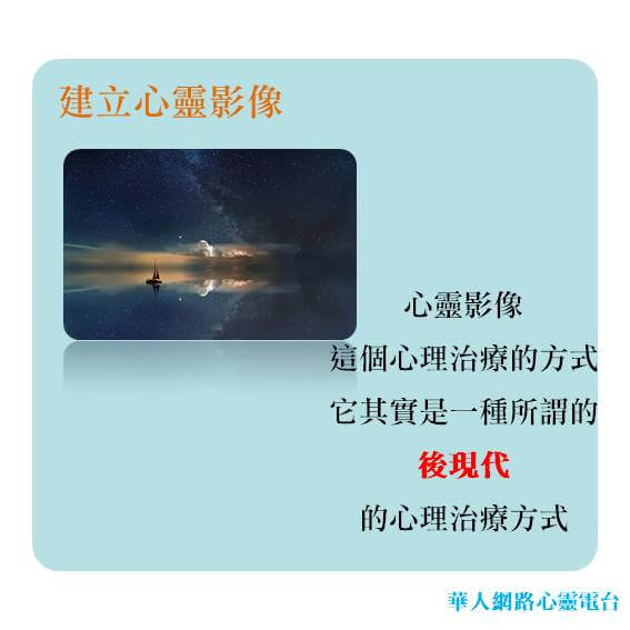 我們可以自己幫自己建立、也可以自己幫別人去建立起適合的心靈影像。心靈影像 -- 這個心理治療的方式它其實是一種所謂的後現代 的心理治療方式,乍聽之下後現代 這三個字聽起來好像很深奧,其實呢~ 所謂的後現代用最簡單的話來講,就是強調治療的快速、有效果。