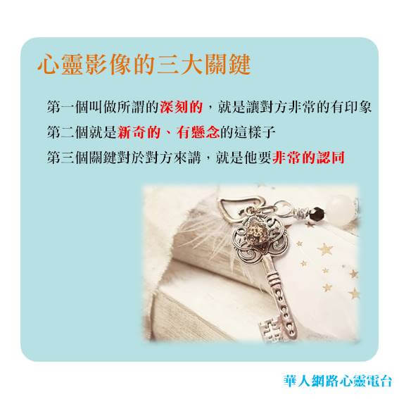 在這邊我想要補充一下,就是所謂心靈影像的建立,它並不只是我們對對方,我們也可以自己幫自己去建立起所謂的心靈影像,那在建立的過程裡所使用的方法跟原則,其實都是一樣的。