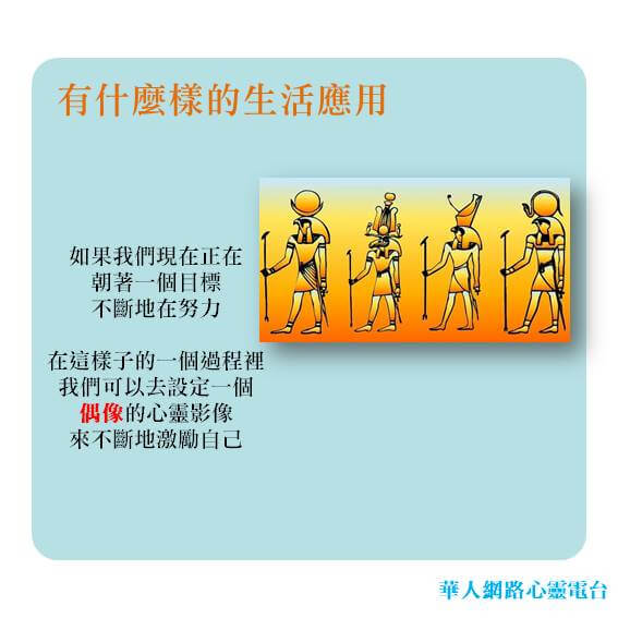 在書裡面,我覺得特別有意思的一個部分,是關於在生活當中怎麼樣去應用心靈影像。舉個例子來講,如果我們現在正在朝著一個目標不斷地在努力,在這樣子的一個過程裡,我們可以去設定一個偶像 的心靈影像,來不斷地激勵自己。