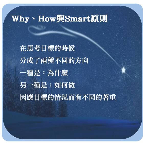 所以來個小小的總結,關於目標的設定,我們就是必須要有適當的思考,包含了為什麼 還有如何做,而且在這整個過程當中,我們的目標可以符合Smart原則。