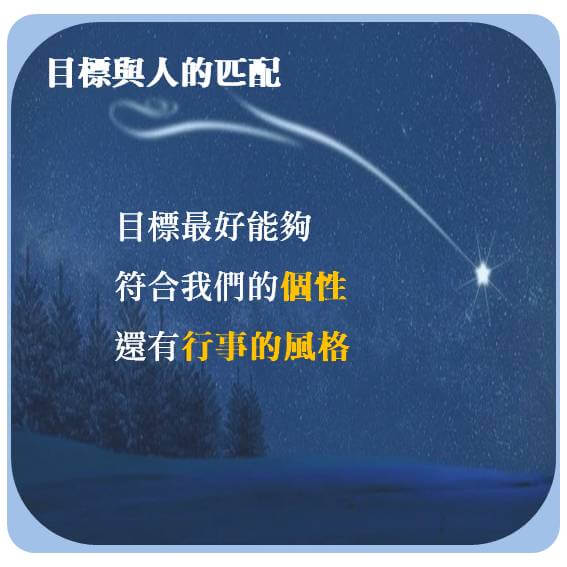 接下來書裡有提到一個很重要的部分,或許很多人沒有想到過的一件事情是---我們在設定目標的時候,這個目標最好能夠符合我們的個性,還有我們的行事的風格