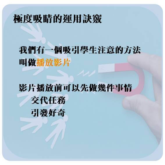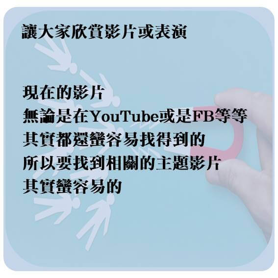 我們可以透過播放主題相關的影片,來凝聚大家對於同一個主題的認知,或者是促進討論的一個氛圍,或者是為了接下來要談的主題來做鋪陳還有延伸。