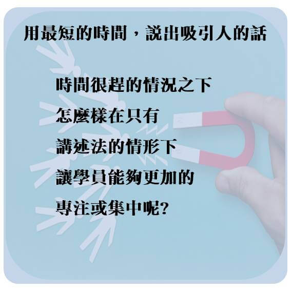 還有一個,如果因為各種因素我們只能用講述的方法,例如說像是內容很多,但是時間很有限,就是時間很趕的情況之下,我們可以怎麼樣在只有講述法的情形下,讓學員能夠更加的專注或集中呢?
