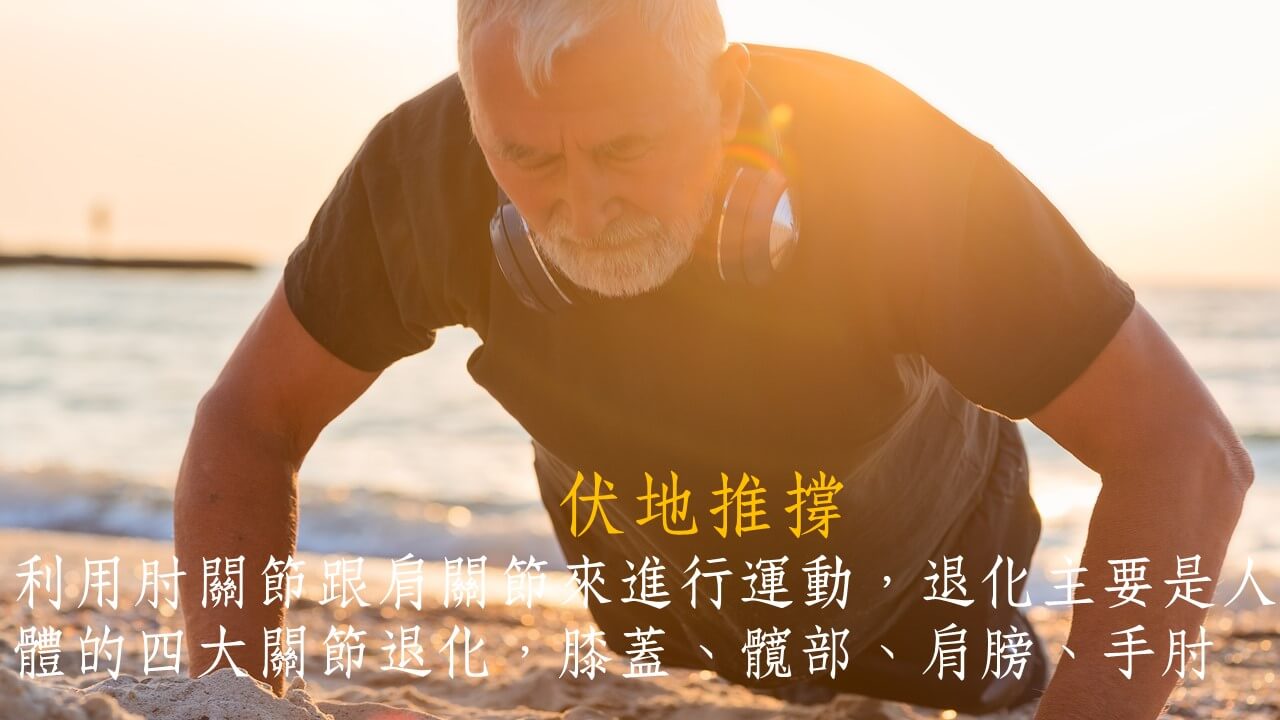 如果推得越來越輕鬆的時候,在試著讓膝蓋離地就比較接近所謂標準的伏地挺身,剛才兩個動作就可以活化我們四個關節。
