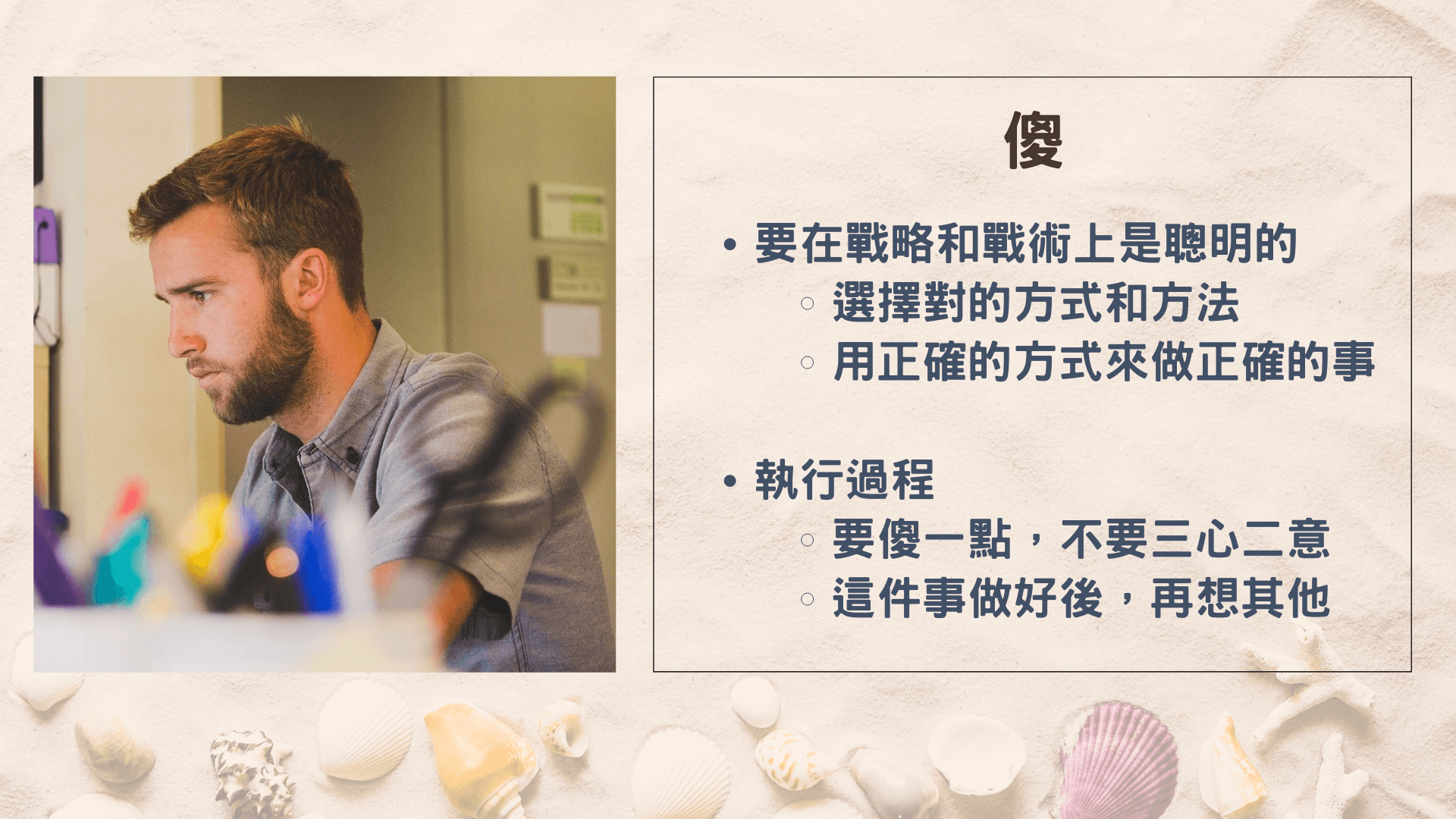 你的戰略、戰術,在經過足夠的分析和思考之後,你發現到做這件事情是OK的,那接下來你就可以傻一點,不要再想其他的,就好好地去執行它,執行到這件事做好了之後,你再去想其他的事。
