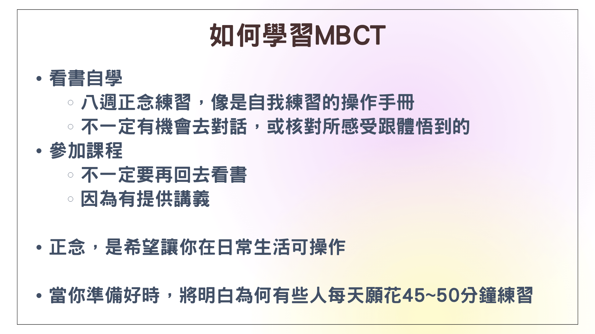 MBCT並不是一個feel good的課程,因為要重新訓練你的大腦,跟你的大腦有一些不同的、新的習慣的對話,所以其實是需要付出一些努力跟練習。